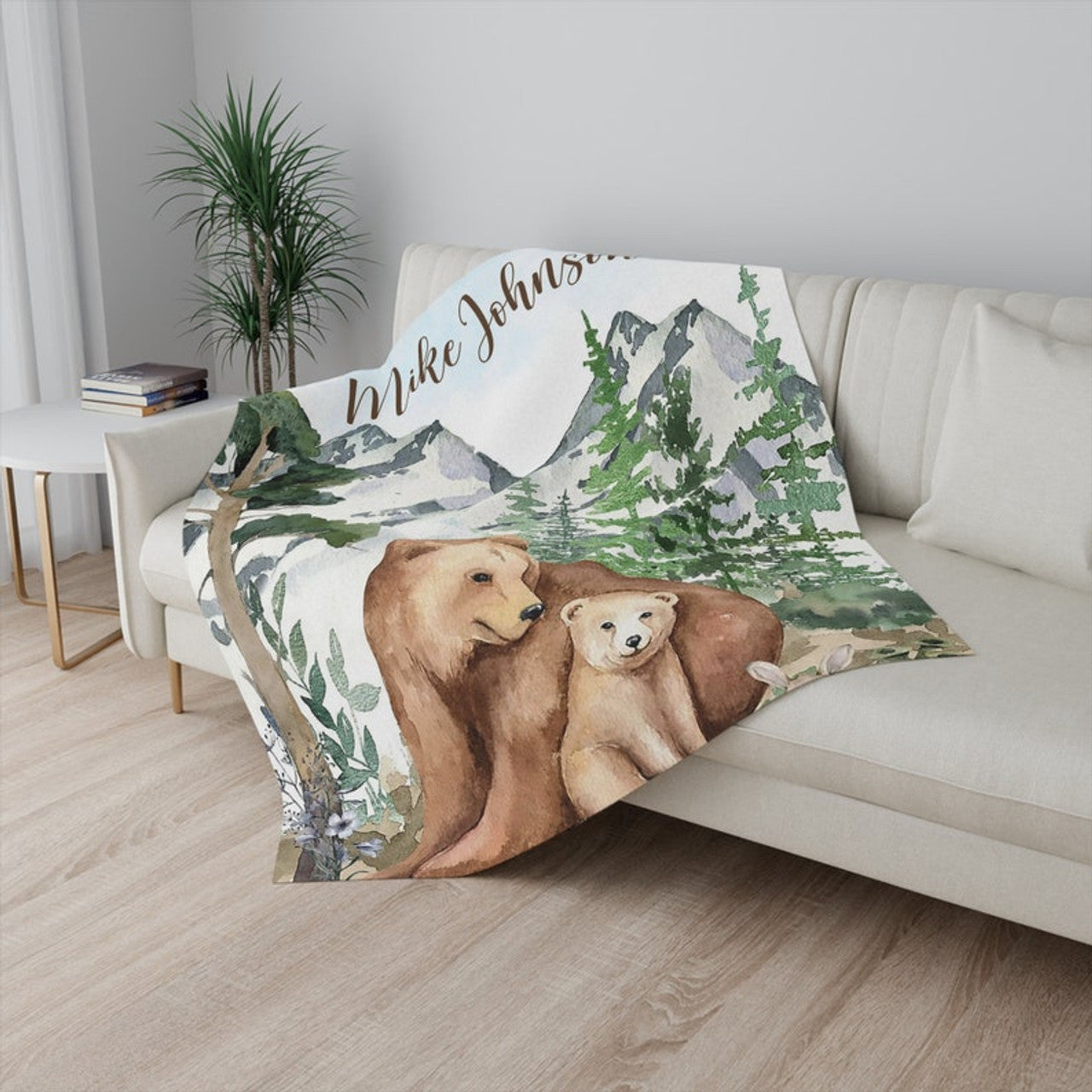 FUNSTUFFPRINT Custom Mom And Baby Bear Nursery Blanket, Personalized Woodland Bear Blanket, Forest Animal Baby Blanket Kids Custom Name Blanket Baby Shower Gift