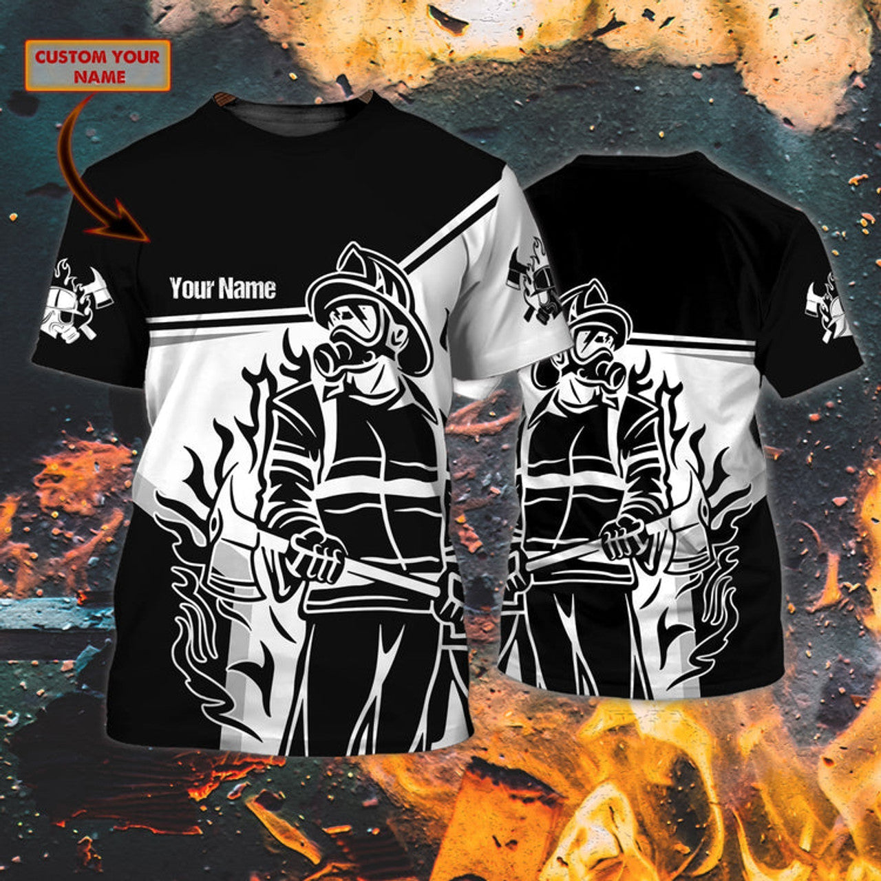 FUNSTUFFPRINT Custom Name Black Sublimation Fire Men Shirt, Firefighter Job T-Shirt, Firefighter Husband Gifts 3D T-shirt