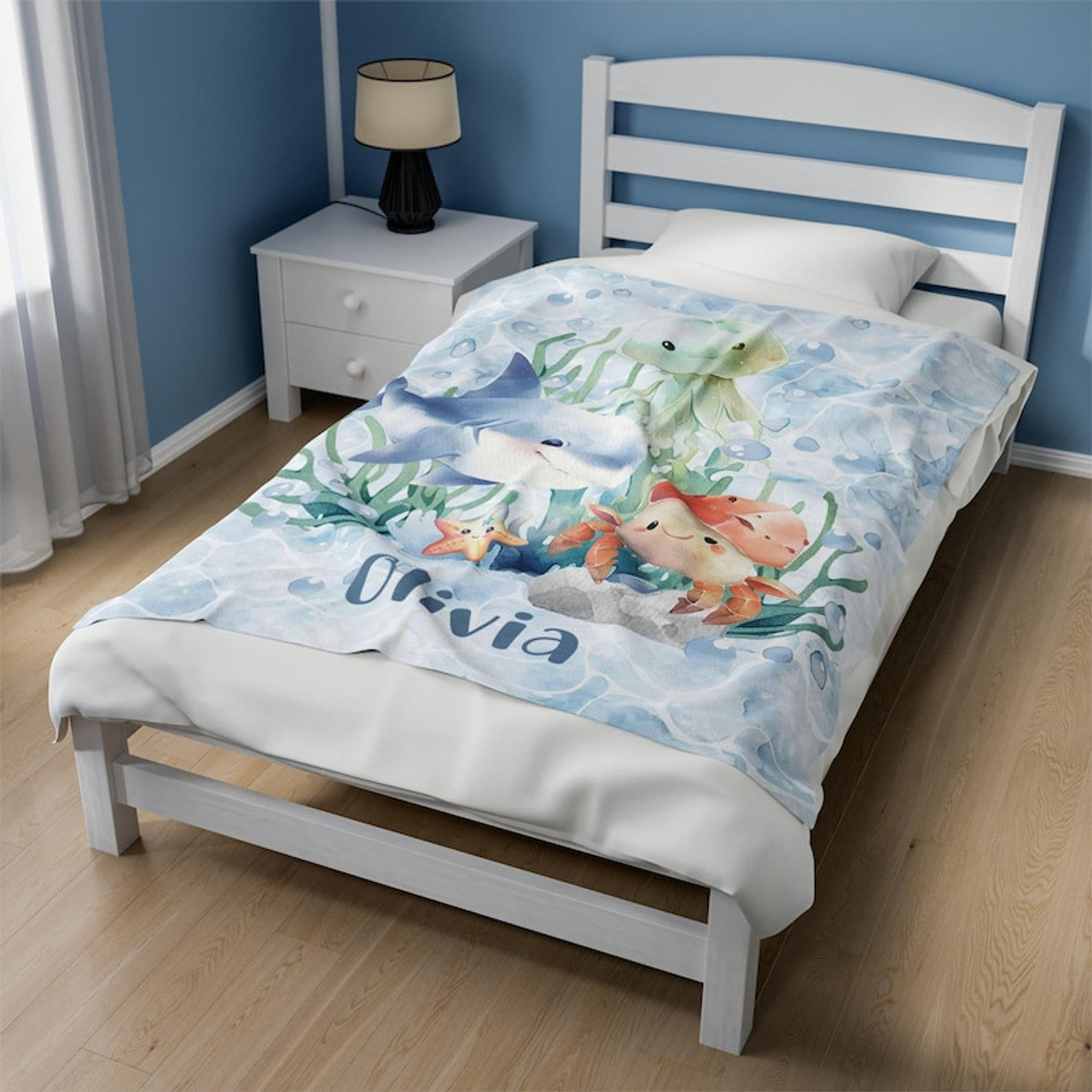 FUNSTUFFPRINT Custom Ocean Animals Nursery Blanket Personalized Baby Blanket Sea Animal Blanket Kids Custom Name Blanket Under The Sea Baby Shower Gift For Boys