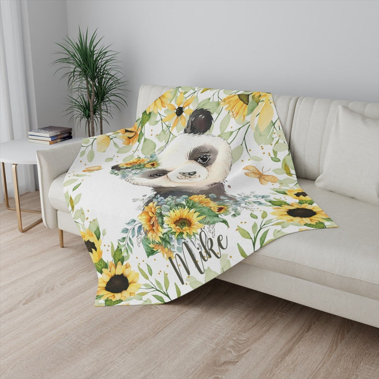 FUNSTUFFPRINT Custom Panda Sunflower Nursery Blanket, Personalized Baby Panda Blanket, Forest Baby Blanket, Kids Custom Name Blanket, Floral Baby Shower Gift