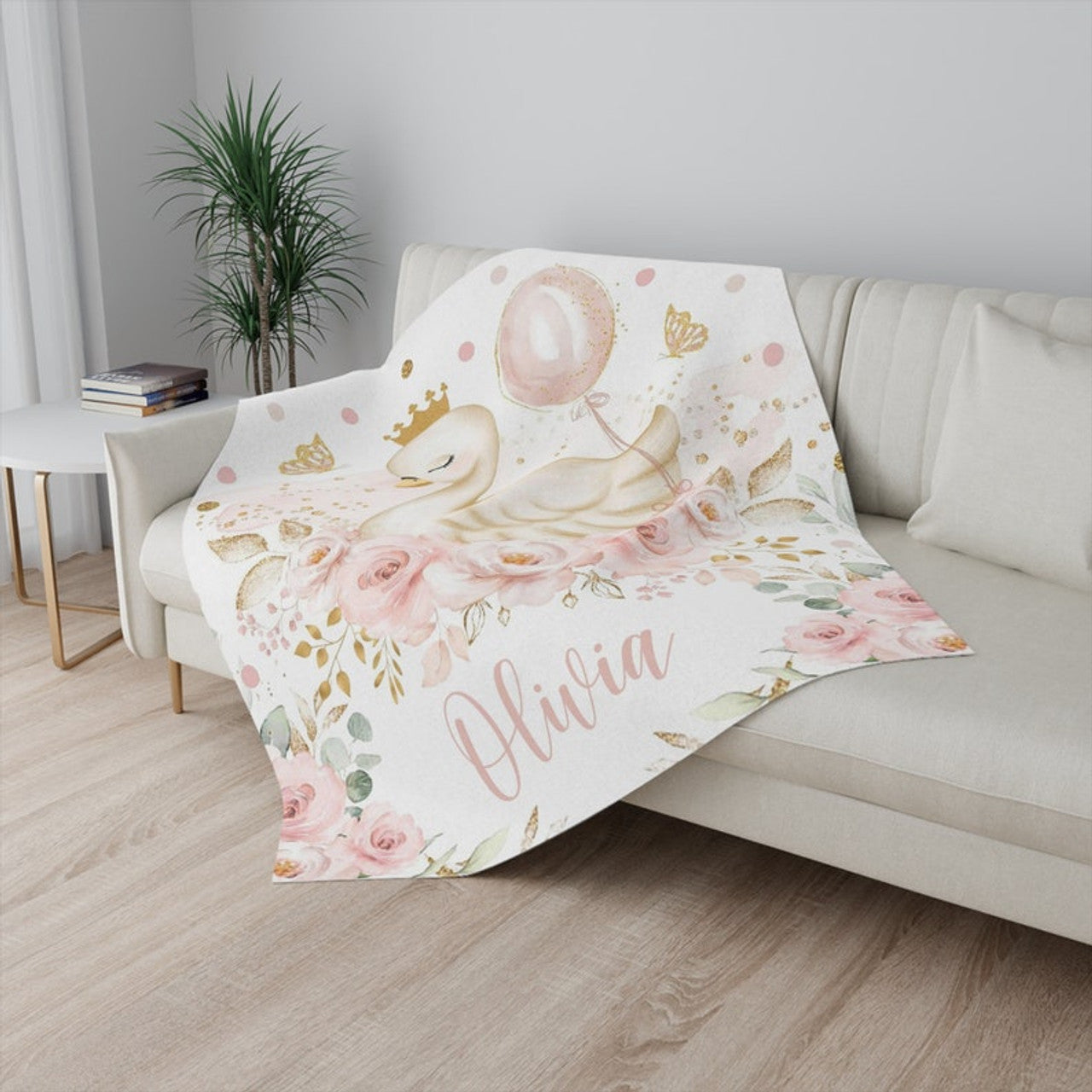 FUNSTUFFPRINT Custom Princess Swan Blanket Personalized Christmas Nursery Blanket Little Swan Kids Custom Name Blanket Spring Floral Baby Shower Gift For Girls