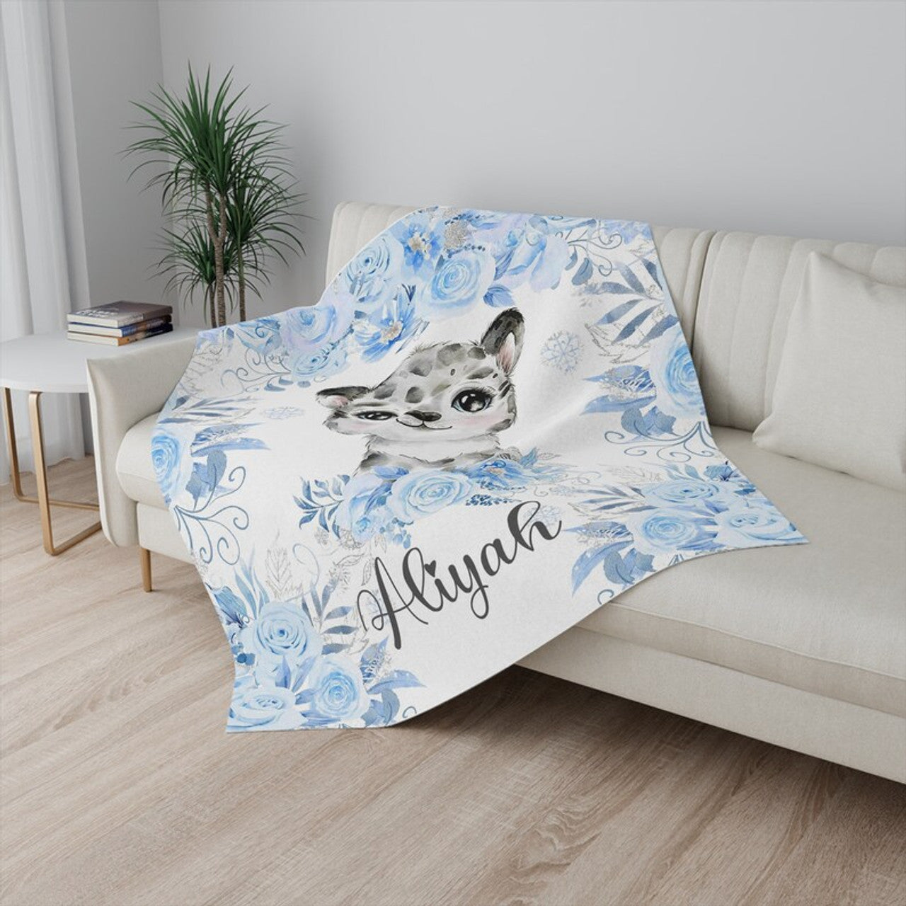FUNSTUFFPRINT Custom Snow Leopard Baby Blanket Personalized Baby Leopard Blanket Arctic Animal Nursery Blanket Kids Name Blanket Winter Floral Baby Shower Gift
