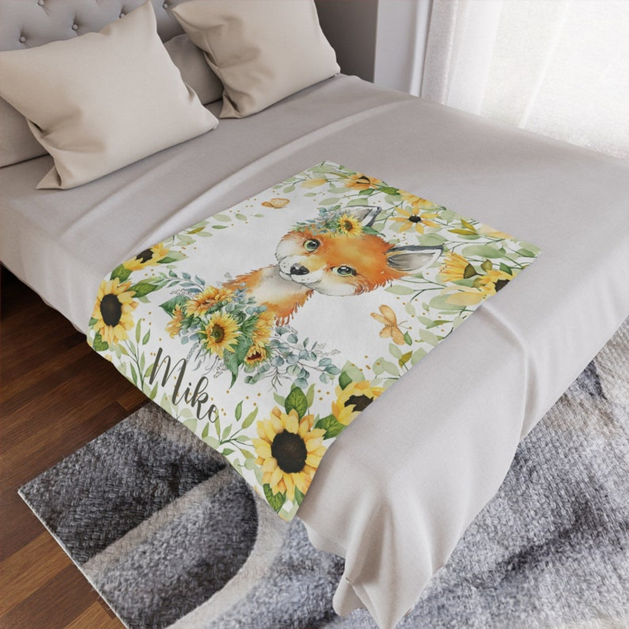 FUNSTUFFPRINT Custom Sunflower Fox Nursery Blanket, Personalized Baby Foxy Blanket, Woodland Animal Baby Blanket Kids Custom Name Blanket Floral Baby Shower Gift