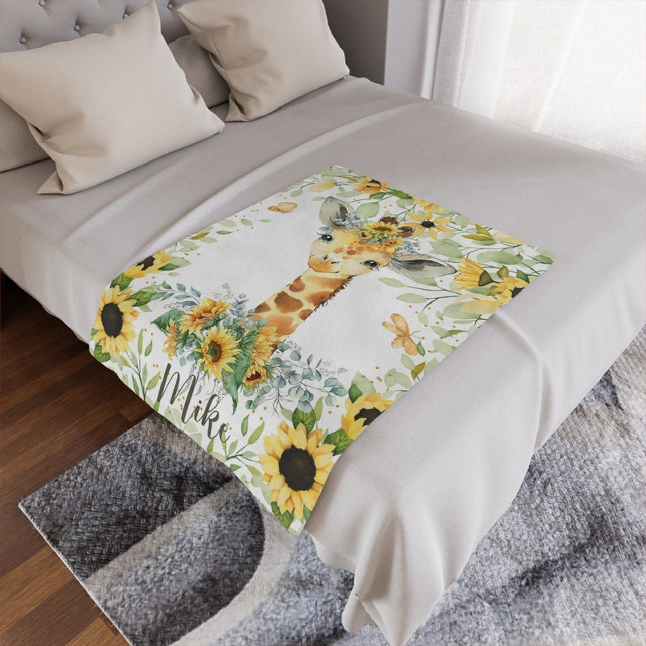 FUNSTUFFPRINT Custom Sunflower Giraffe Nursery Blanket, Personalized Baby Animal Blanket, Safari Baby Blanket, Kids Custom Name Blanket, Floral Baby Shower Gift