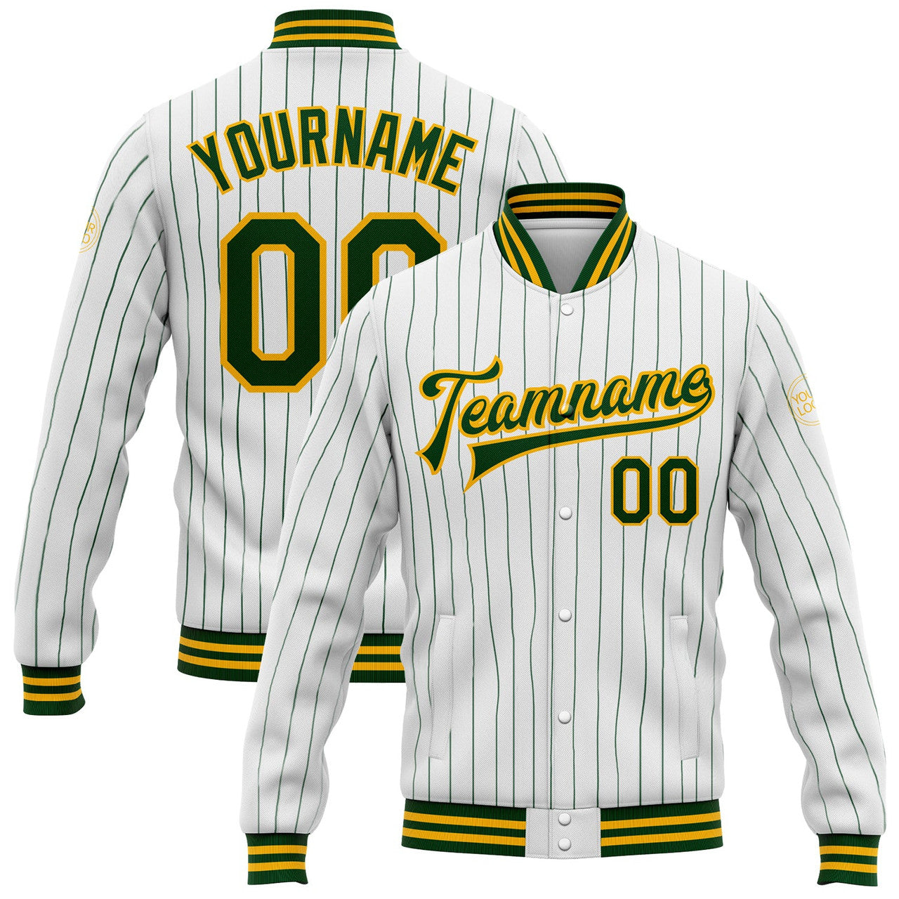 FUNSTUFFPRINT Custom White Green Pinstripe Gold Bomber Full-Snap Varsity Letterman Jacket 3D Baseball Jacket