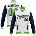 FUNSTUFFPRINT Custom White Neon Green-Navy Bomber Full-Snap Varsity Letterman Two Tone Jacket 3D Baseball Jacket