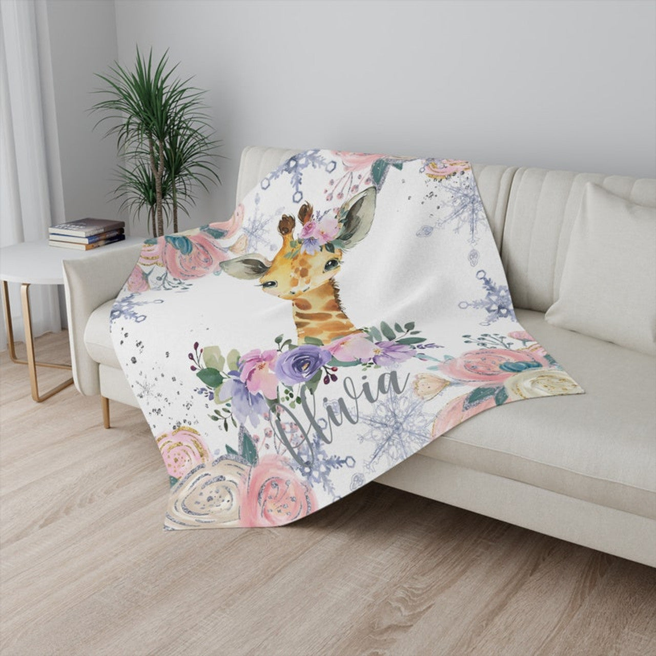 FUNSTUFFPRINT Custom Winter Floral Giraffe Nursery Blanket, Personalized Baby Giraffe Blanket, Christmas Baby Blanket Kids Custom Name Jungle Baby Shower Gift