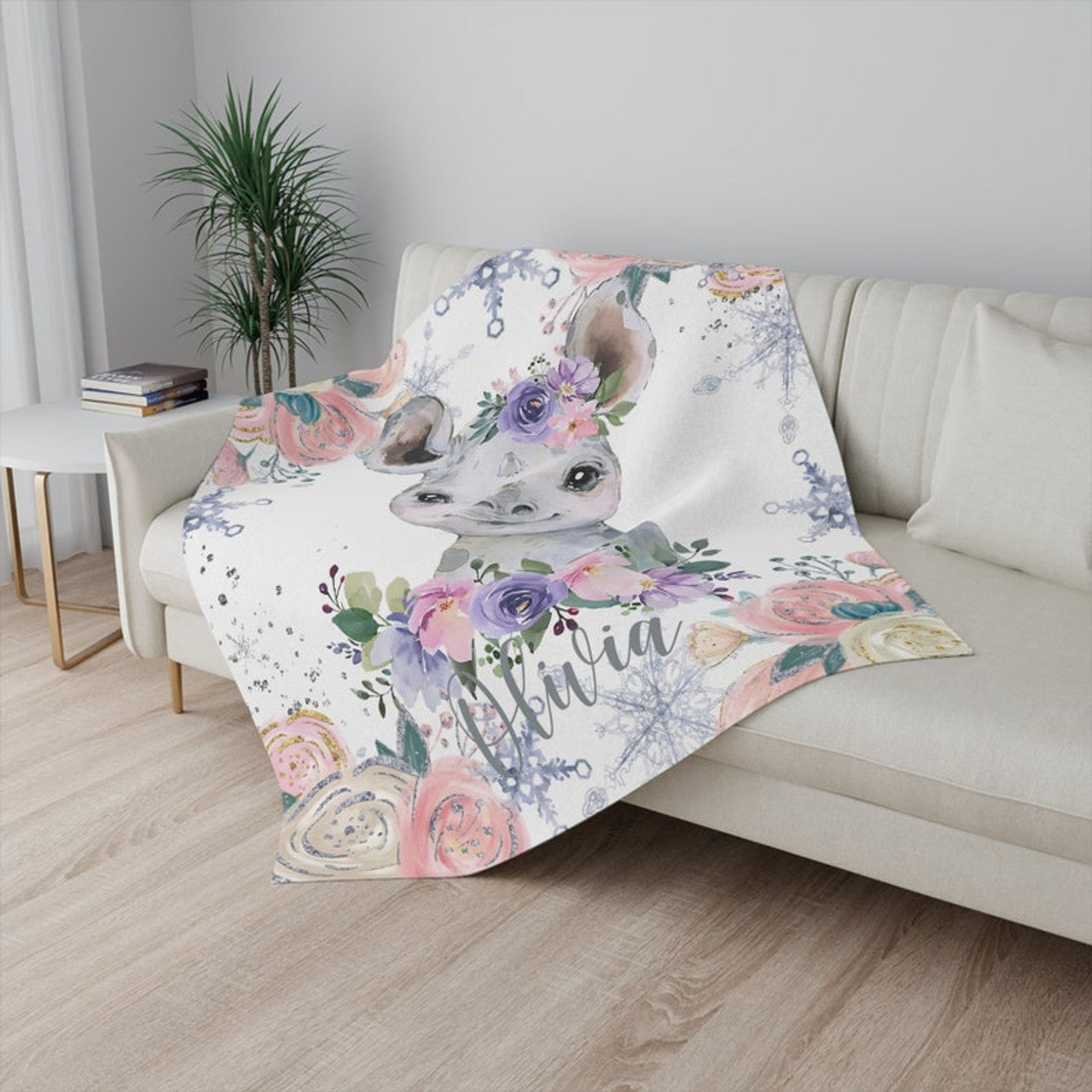 FUNSTUFFPRINT Custom Winter Floral Rhino Nursery Blanket, Personalized Baby Rhino Blanket Christmas Baby Blanket Kids Custom Name Blanket Jungle Baby Shower Gift