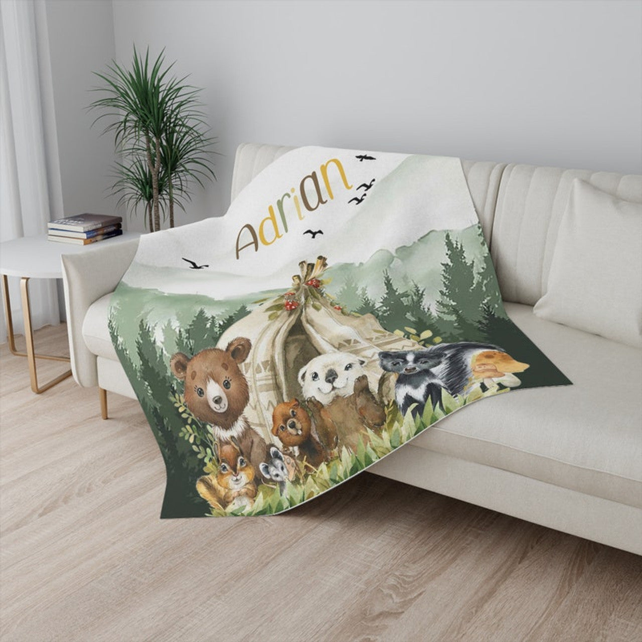 FUNSTUFFPRINT Custom Woodland Nursery Blanket, Personalized Forest Animals Blanket, Safari Animal Baby Blanket, Kids Custom Name Blanket, Baby Shower Gift