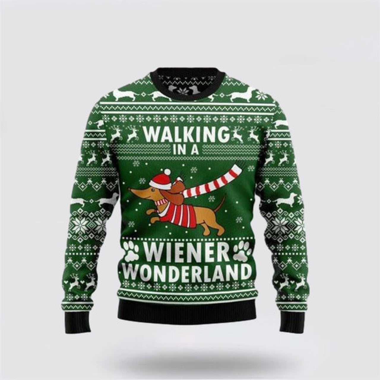 FUNSTUFFPRINT Dachshund Dog Walking In A Wiener Wonderland Ugly Christmas Sweater For Men And Women, Gift For Christmas, Best Winter Christmas Outfit Ugly Sweater
