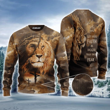 FUNSTUFFPRINT Lion Christ Let Your Faith Be Bigger Ugly Sweater, Christmas Sweater For Men & Women Ugly Sweater