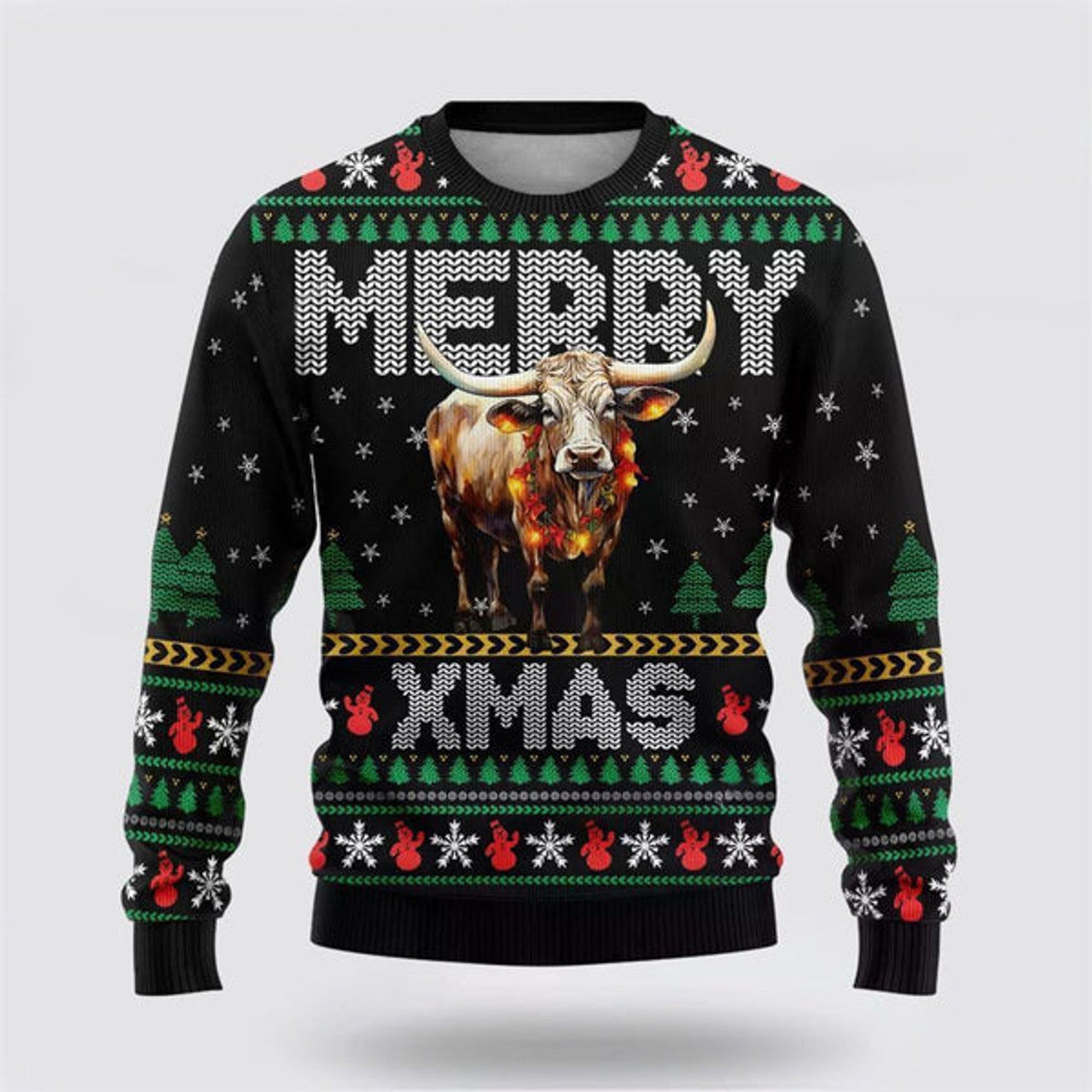FUNSTUFFPRINT Longhorn Ugly Christmas Sweater, Farm Sweater, Christmas Gift, Best Winter Outfit Christmas Ugly Sweater