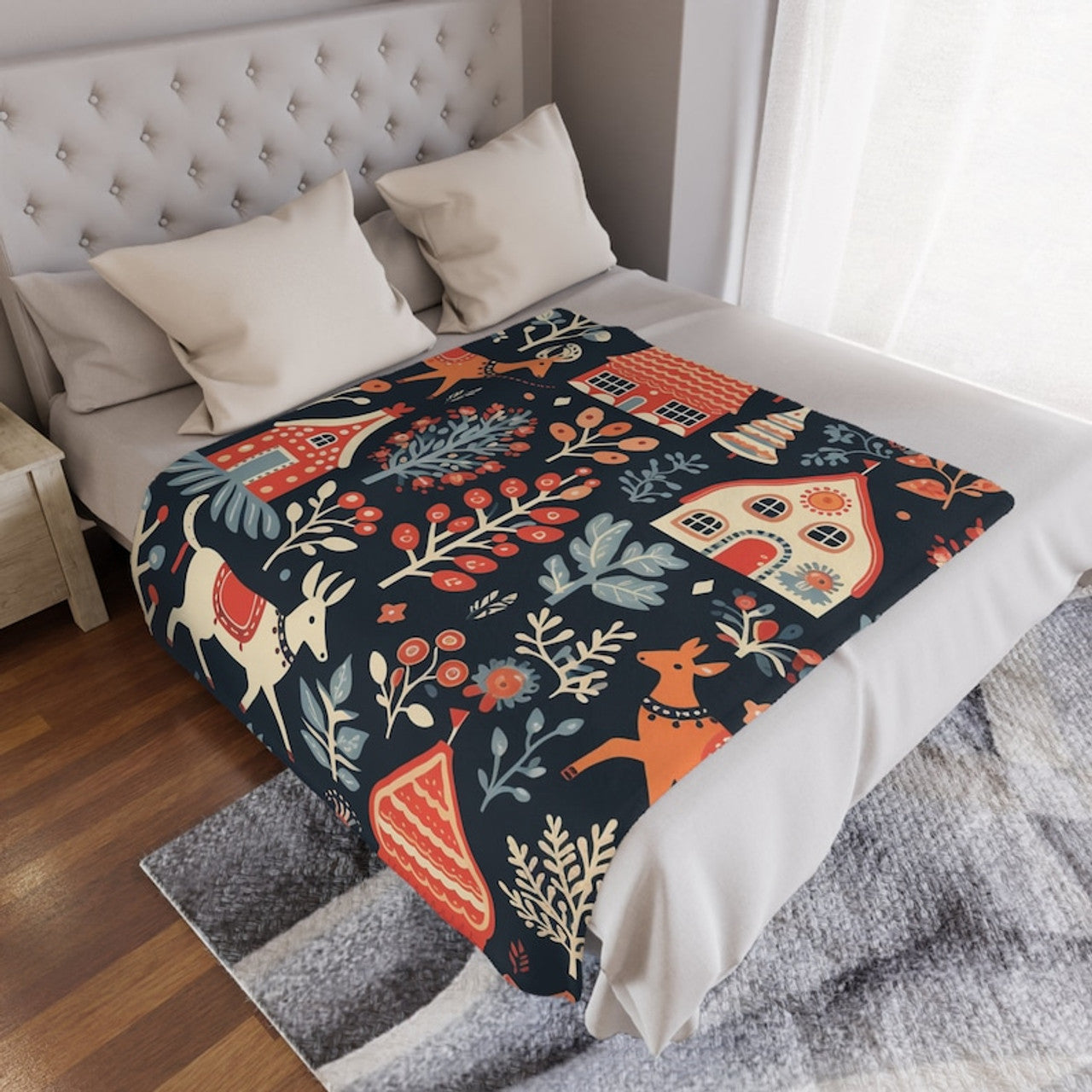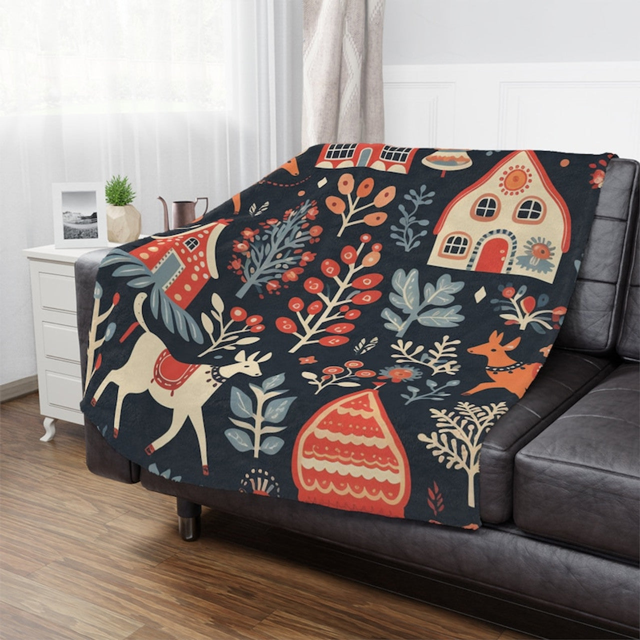FUNSTUFFPRINT Nordic Folk Art Minky Blanket, Soft Fleece, Scandinavian Design, Winter Throw for Bed or Couch, Soft Winter Blanket, Scandi Home Decor