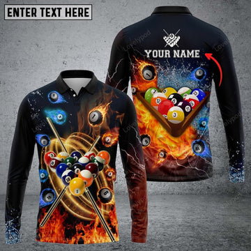 FUNSTUFFPRINT Personalized Billiard Ball Flag Team Name Player Long Sleeve Polo Shirt, Billiards Shirts, Billiards Apparel