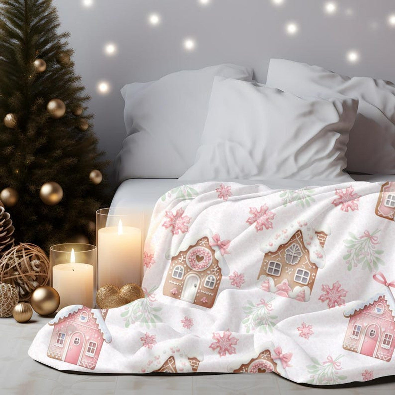 FUNSTUFFPRINT Pink Gingerbread Aesthetic Velveteen Blanket | Cozy Gingerbread Holiday Dorm Room Blanket | Holiday Gift ideas for Roommate
