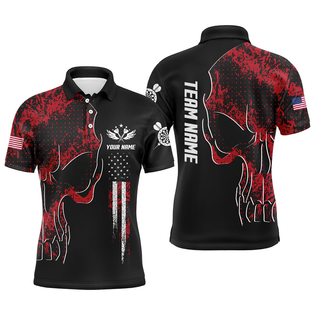 FUNSTUFFPRINT Red Grunge Camo American Flag Skull Darts Mens Polo Shirt Patriotic Dart Polo Shirt Size S-5XL