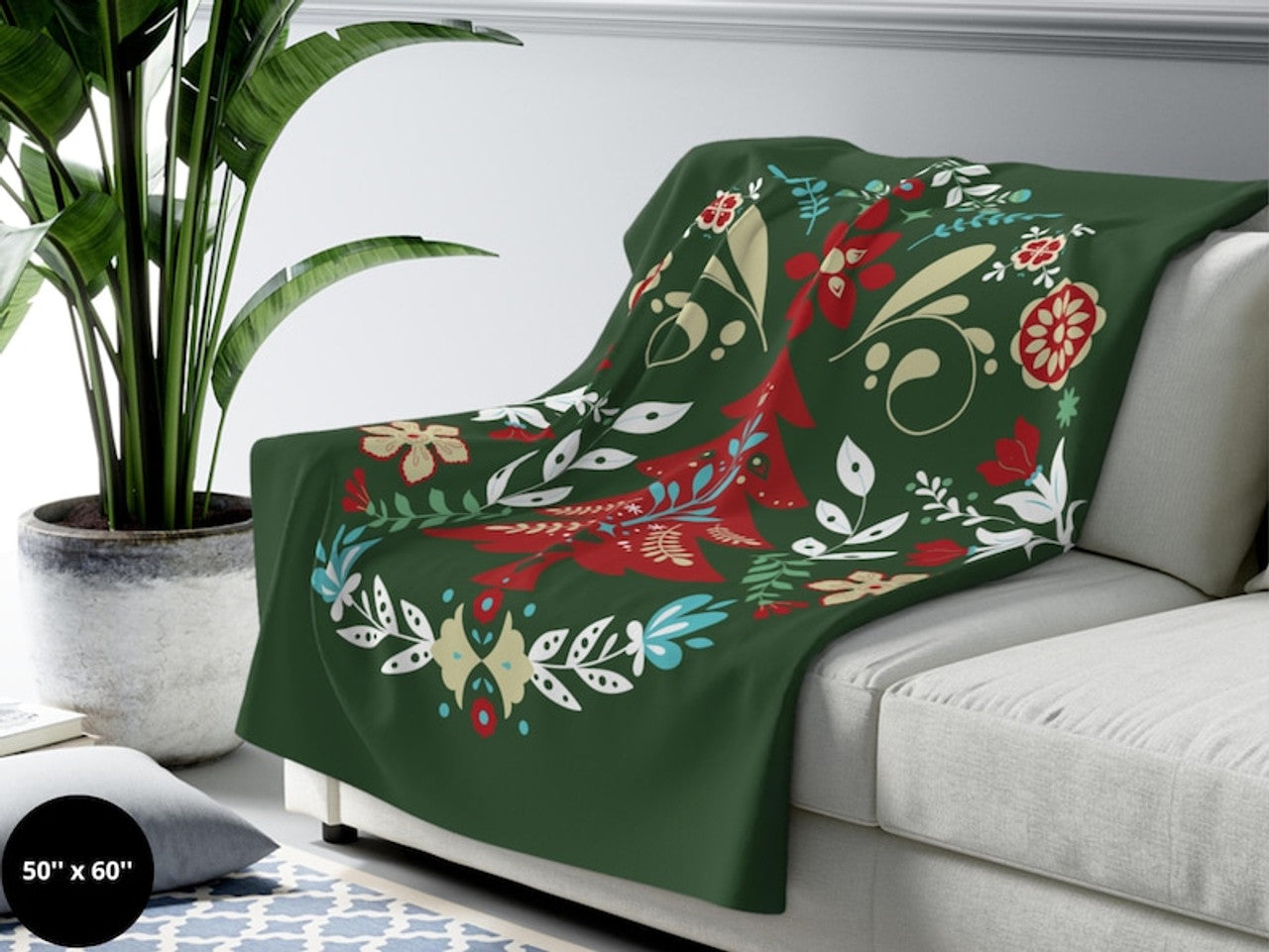 FUNSTUFFPRINT Scandinavian Christmas Blanket| Norwegian Folk Art Blanket |Norwegian Christmas Tree Blanket| Swedish Folk Art Gift |Nordic Home Decor