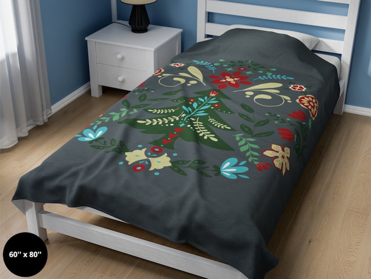 FUNSTUFFPRINT Scandinavian Folk Art Blanket| Norwegian Folk Art Throw Blanket |Norwegian Christmas Tree Blanket| Swedish Folk Art Gift |Nordic Home Decor