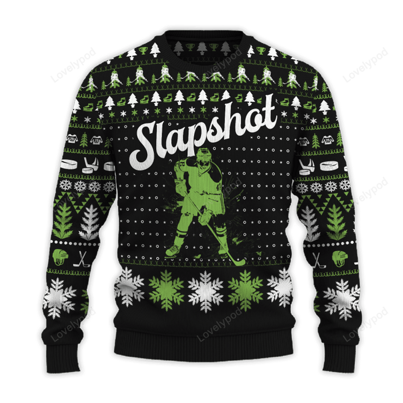 FUNSTUFFPRINT Slapshot Hockey Ugly Christmas Sweater, Hockey Ugly Christmas Sweaters for Men and Women Ugly Sweater