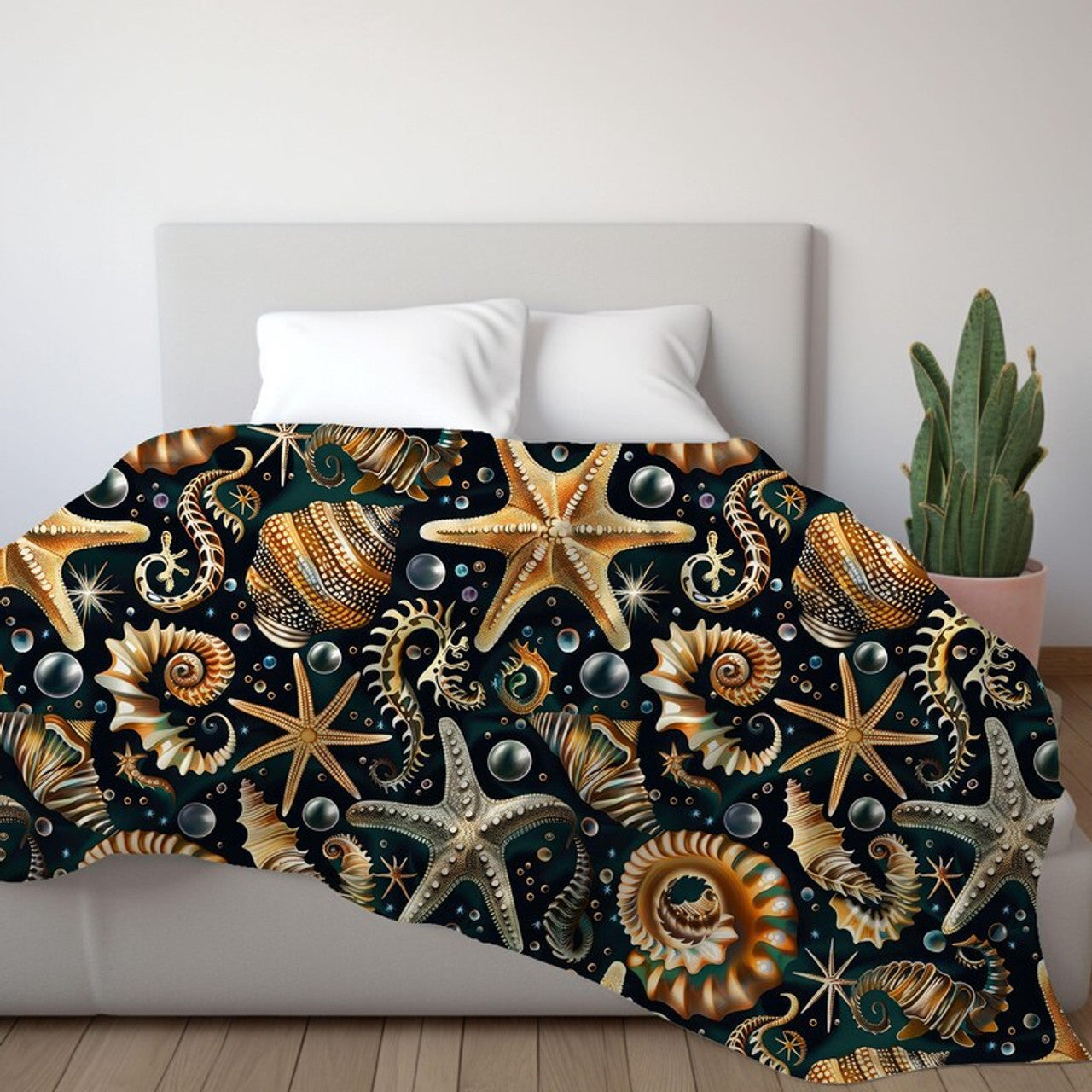 FUNSTUFFPRINT Starfish And Shells Coastal Throw Blanket, Nautical Christmas Gift For Best Friend, Beach Lover Gift, Ocean Theme Decor, Beach Bedding