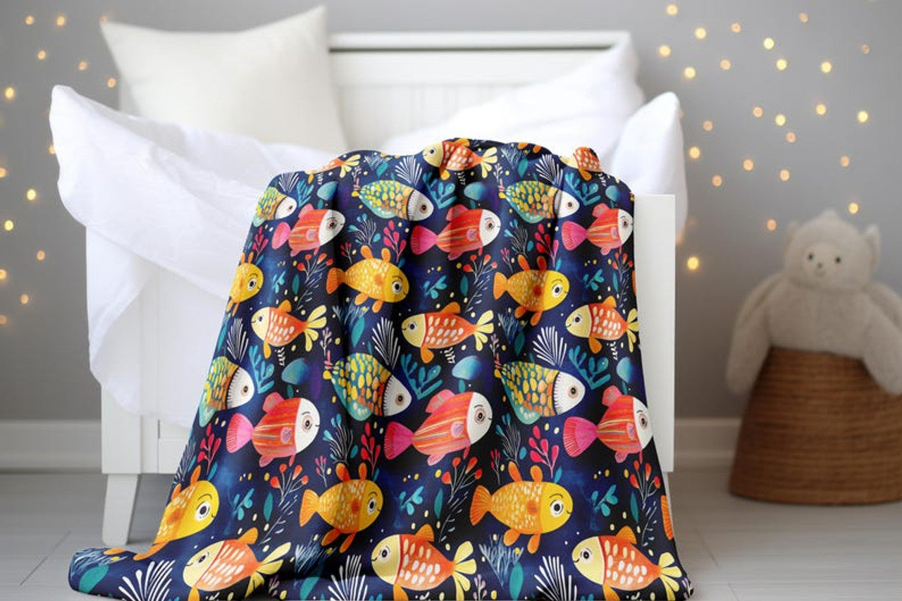 FUNSTUFFPRINT Whimsical Colorful Fish Baby Blanket, Cute Full Print Fish Velveteen Blanket, Sherpa Blanket Nursery Room Decor