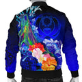 FUNSTUFFPRINT Pohnpei Custom Personalised Men's Bomber Jacket - Humpback Whale with Tropical Flowers (Blue)- 3D Bomber Jacket