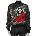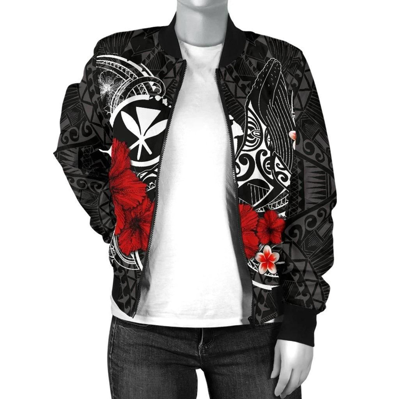FUNSTUFFPRINT Polynesian Hawaii Kanaka Maoli Women's Bomber Jacket - Humpback Whale with Hibiscus (White) - 3D Bomber Jacket