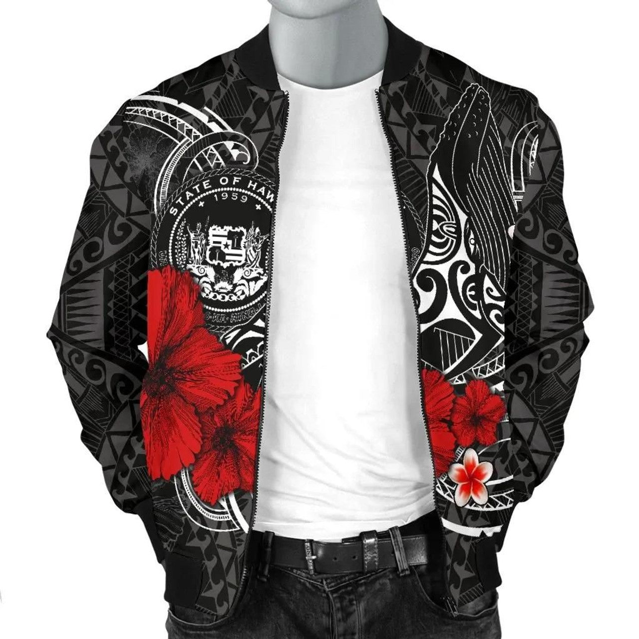 FUNSTUFFPRINT Polynesian Hawaii Men's Bomber Jacket - Humpback Whale with Hibiscus (White) - 3D Bomber Jacket