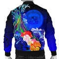 FUNSTUFFPRINT Polynesian Hawaii Men's Bomber Jacket - Humpback Whale with Tropical Flowers (Blue)- 3D Bomber Jacket