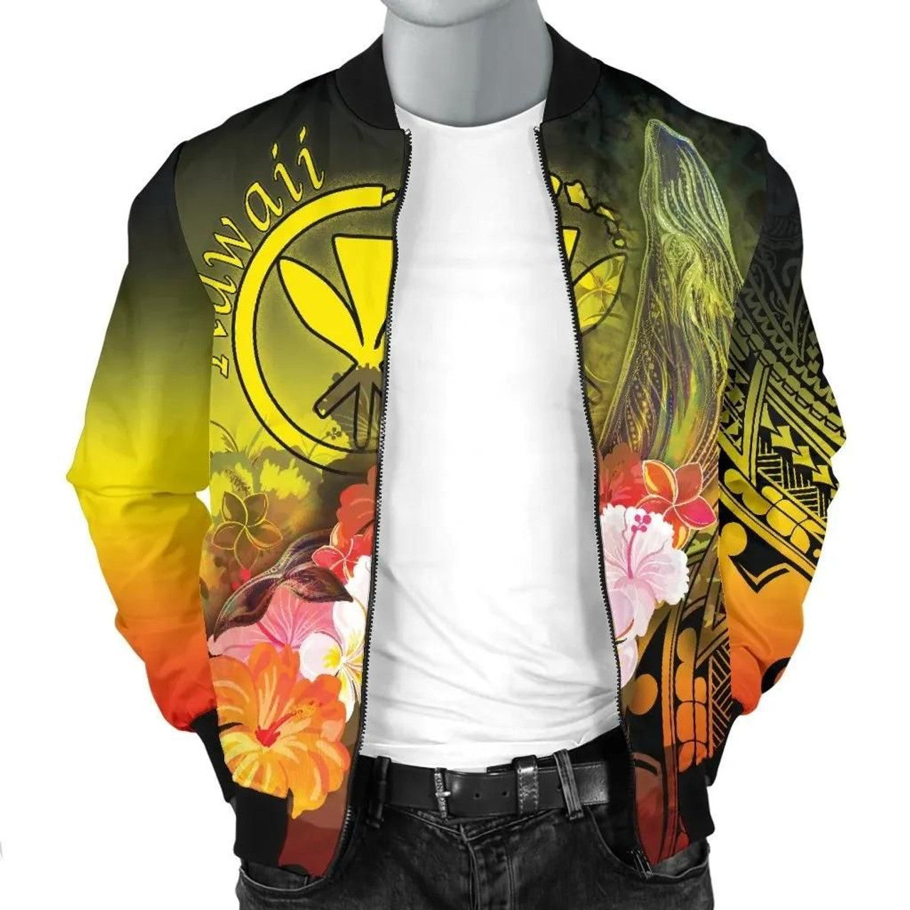 FUNSTUFFPRINT Polynesian Hawaii Men's Bomber Jacket - Kanaka Maoli Humpback Whale with Tropical Flowers (Yellow)- 3D Bomber Jacket