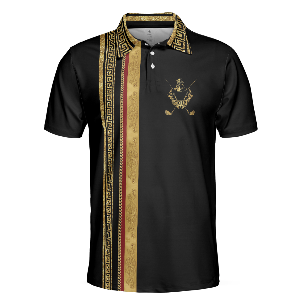Golf Crusader King Luxury Baroque Pattern Golf Polo Shirt, Elegant Black Golfing Polo Shirt, Best Golf Shirt For Men