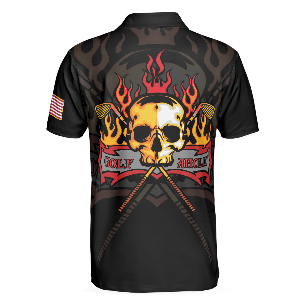 Golf Flame Skull Short Sleeve Golf Men Polo Shirt, Black American Flag Golf Shirt For Men, Cool Gift For Golfers