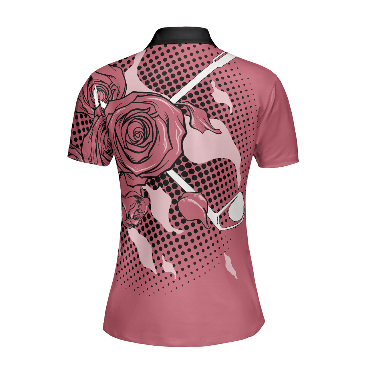 Golf Pink Skull Ladies Short Sleeve Women Polo Shirt, Rose Golf Shirt For Ladies, Cool Female Golf Gift