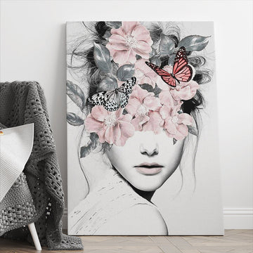 Nordic Flowers And Butterflies Head Woman Painting Canvas Prints And Poster