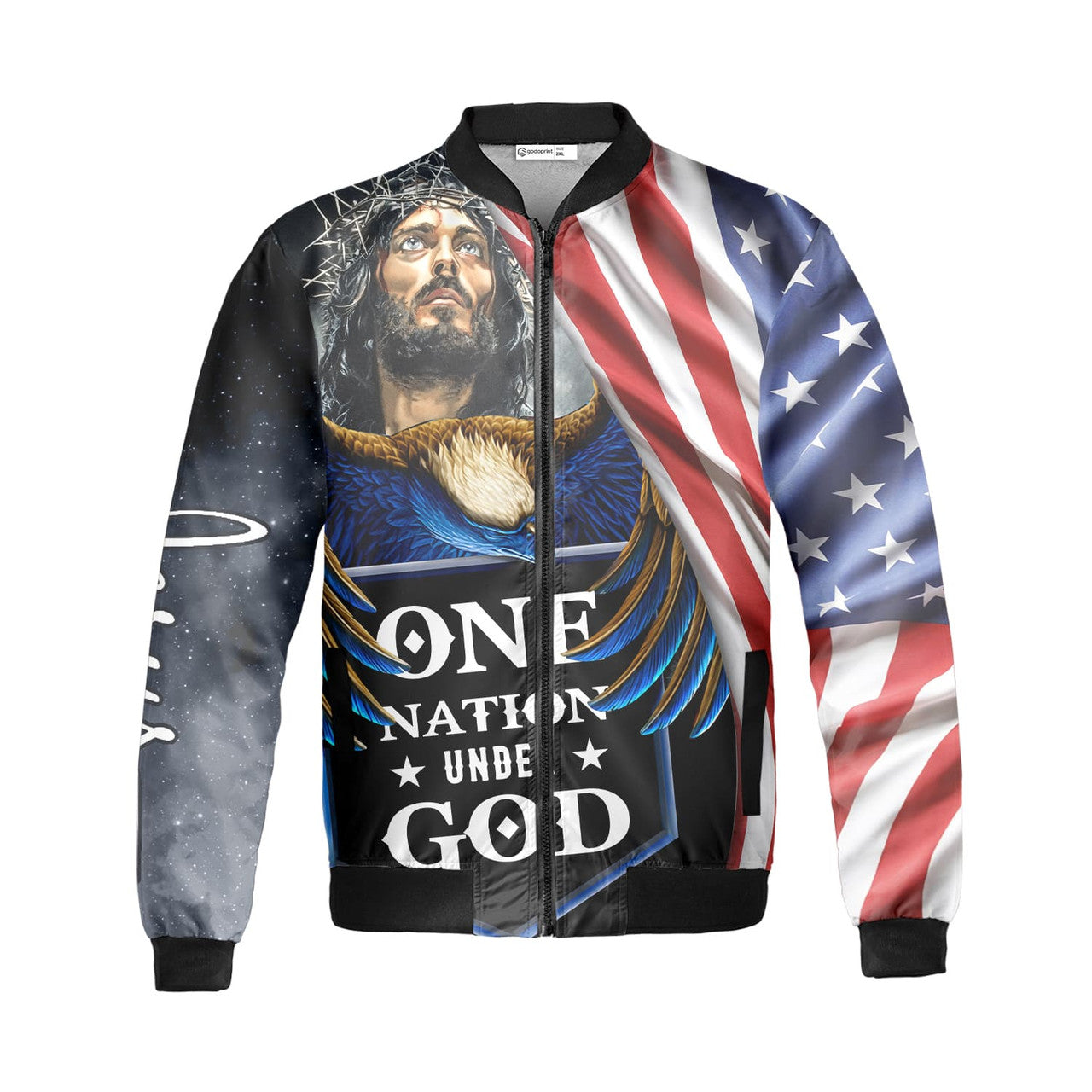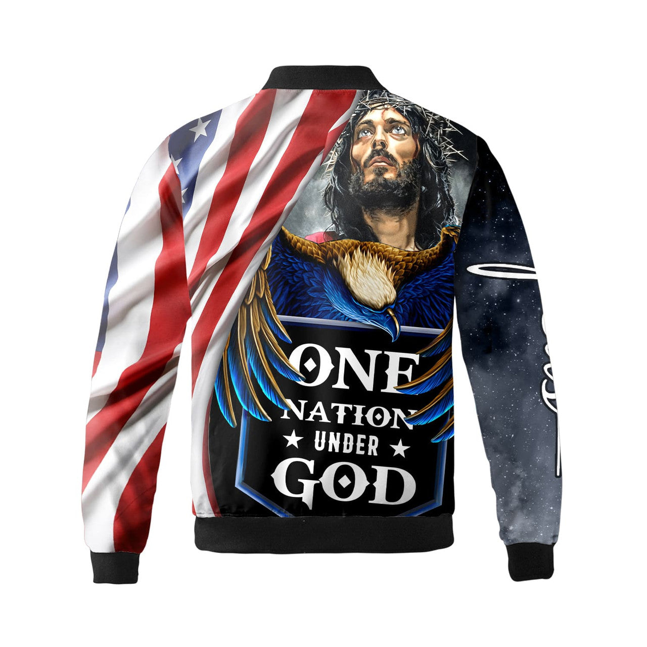 One Nation Under God Eagle America Flag Jesus Fleece Bomber Jacket AOP Zip-up Gift for Christians