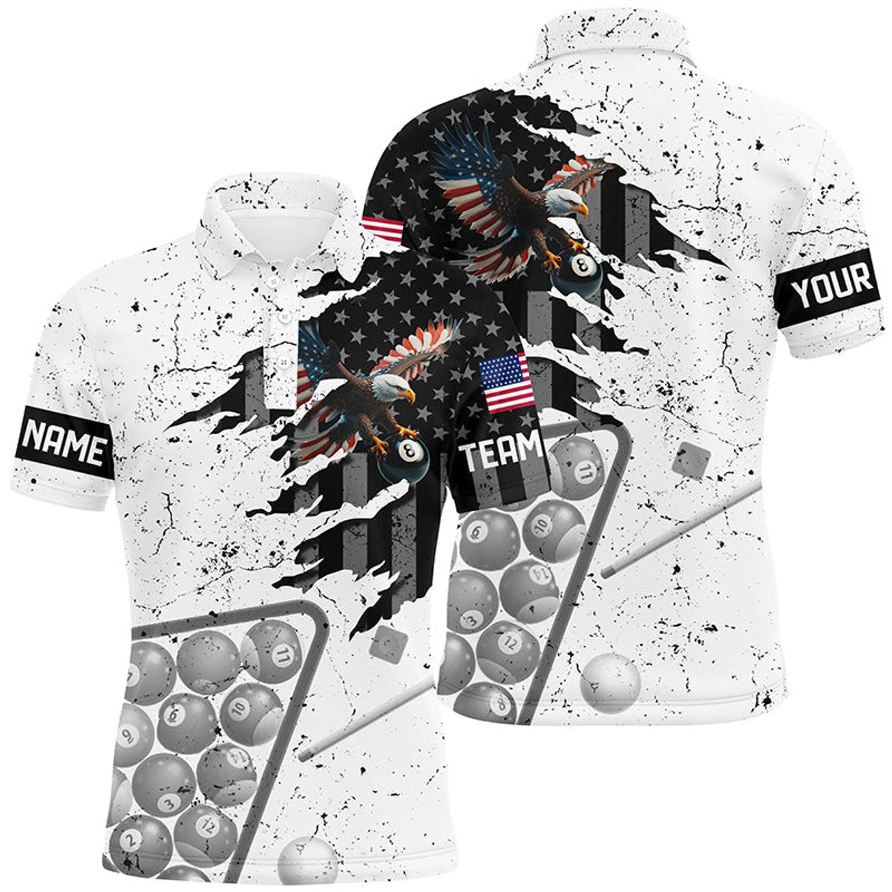 Personalized Eagle Retro American Flag Men Billiard Polo Shirts, Patriotic Pool Player Shirts