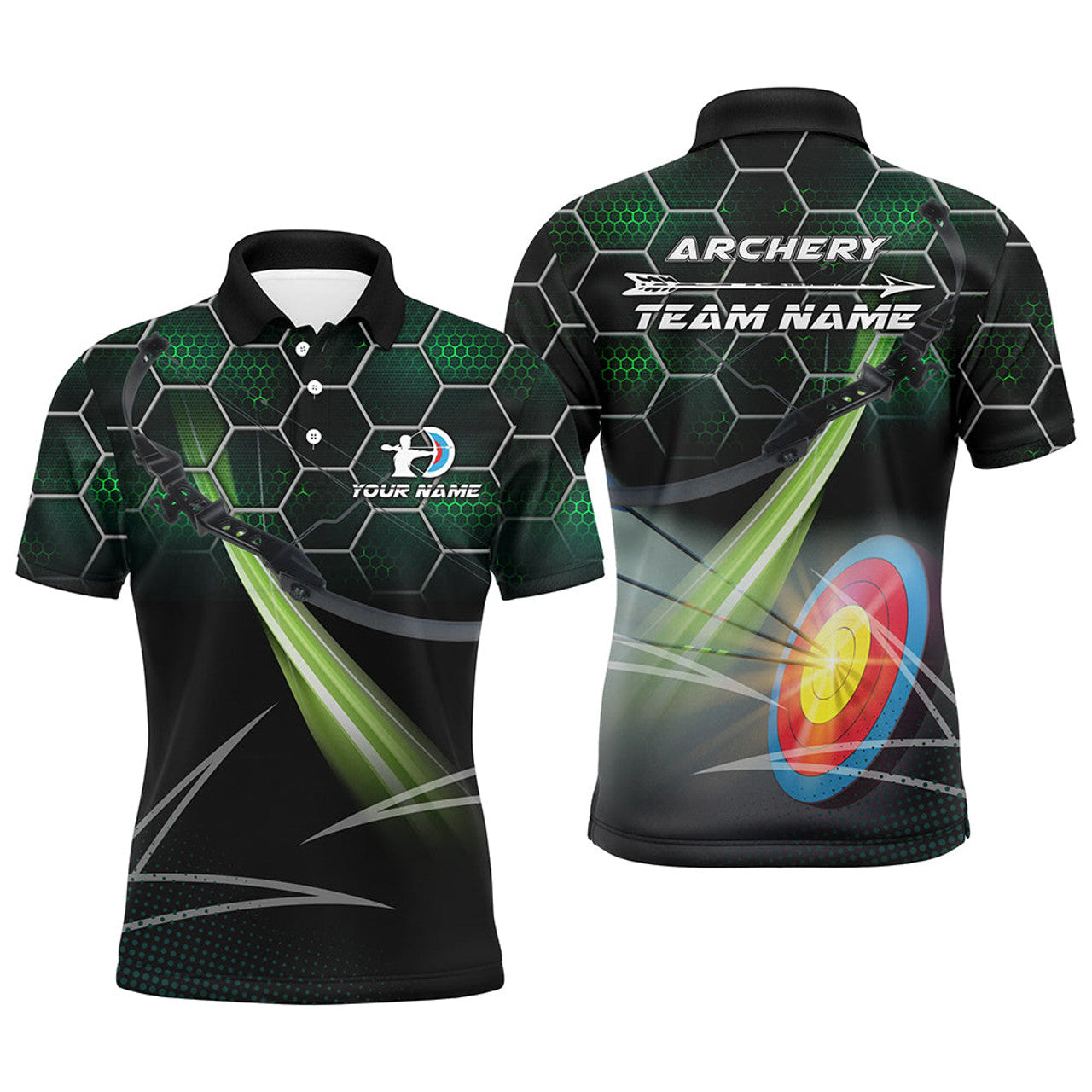 Personalized Green 3D Target Archery Polo Shirts For Men, Custom Name Arrow Archery Team Shirts