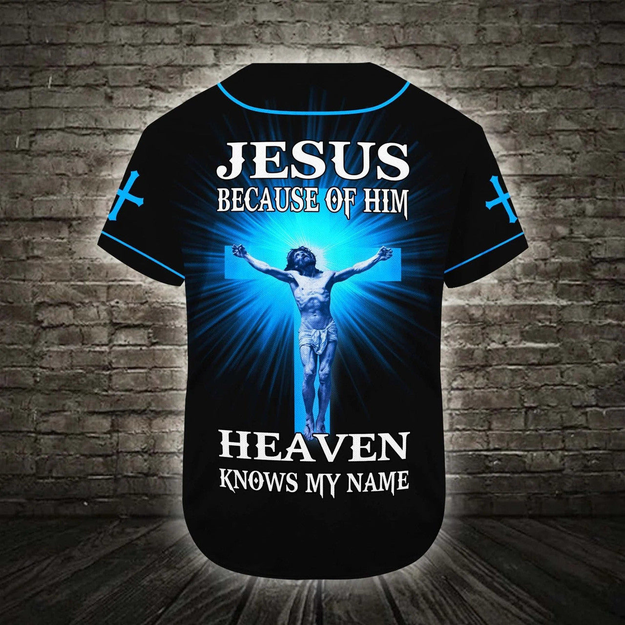 Personalized Jesus Baseball Jersey - Cross Baseball Jersey - Gift For Christians - Because Of Him Heaven Knows My Name Custom Baseball Jersey
