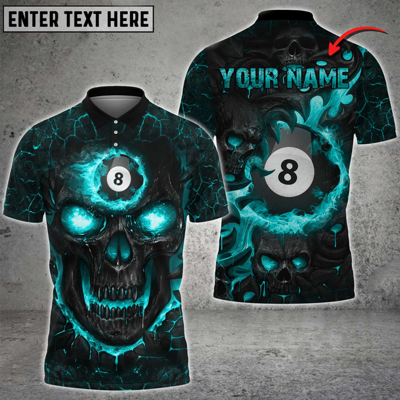 Personalized Name Team Billiards Ball 8 Skull Fire Polo Shirt, Billiard Skull Lover