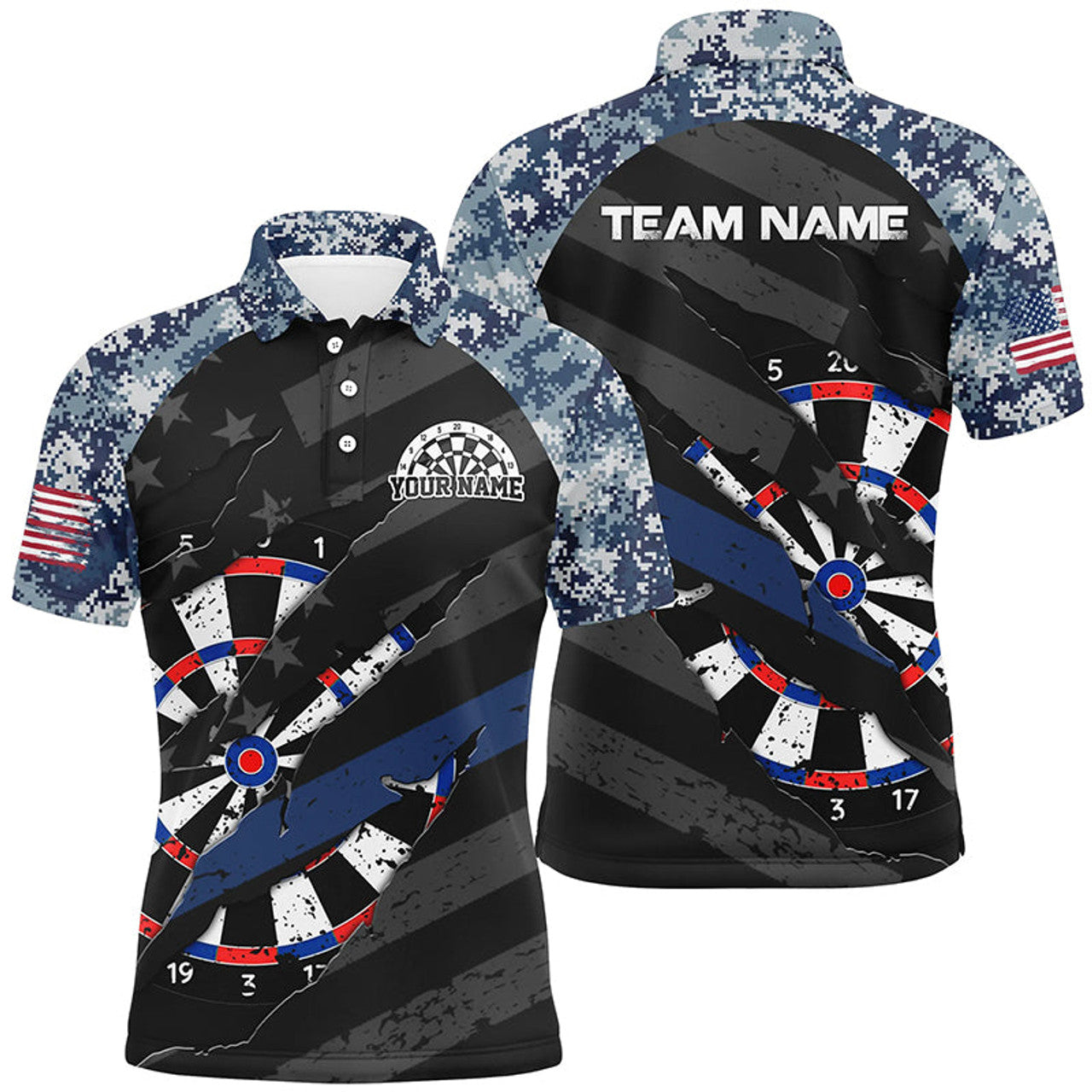 Personalized Retro Camo Blue Dart 3D Polo Shirts For Men, Custom American Flag Mens Dart Jerseys