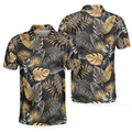 Seamless Luxury Tropical Pattern Golf Polo Shirt, Black And Gold Best Floral Golf Shirt For Men