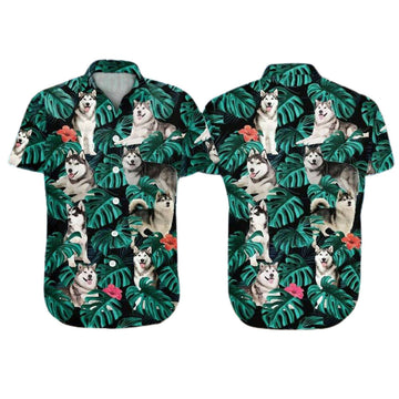 usky Dog Aloha Hawaiian Shirt - Funny Husky Dog Pet Hawaiian Shirt, Tropical Leaves Pattern Hawaiian Shirt For Men